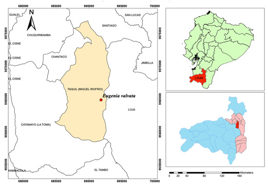The leaves of Eugenia valvata in flowering stage were collected in the Chuquiribamba sector of the Loja province (latitude 3°56′06″ S and longitude 79°16′20″ W), on November 2021, as shown in Figure 4. The leaves were cleaned and stored at 0 °C until EO extraction. The identification was conducted by Dr. Nixon Cumbicus, botanist of the Universidad Técnica Particular de Loja (UTPL) and deposited in the herbarium HUTPL with the voucher code 14551; finally, the plant collection was authorized by the government of Ecuador with code MAE-DBN-2016-048.