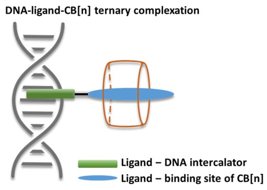 Schematic presentation of a ternary complex between DNA, a small heterocyclic ligand, and a CB[n].