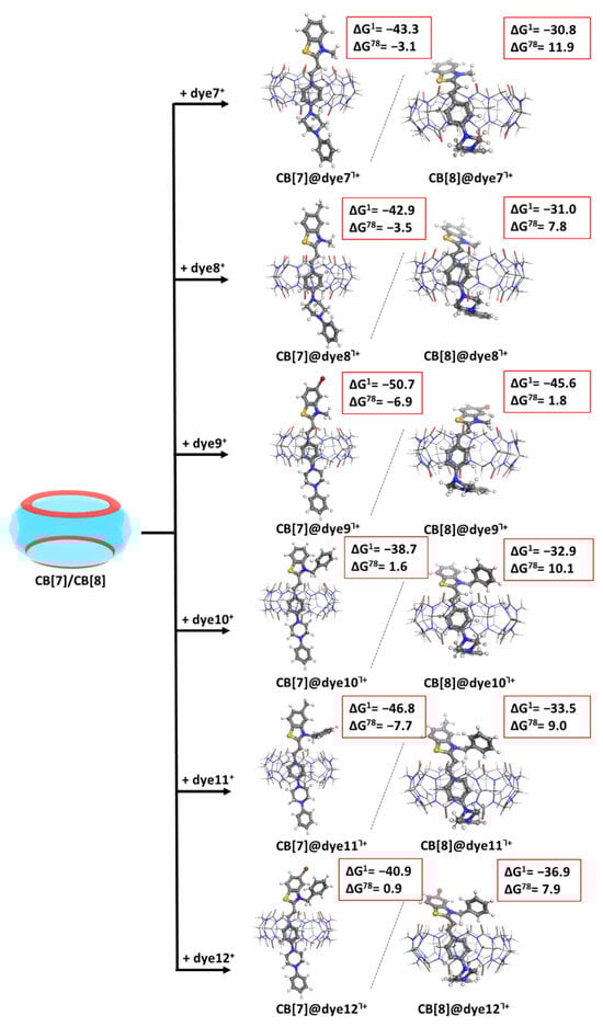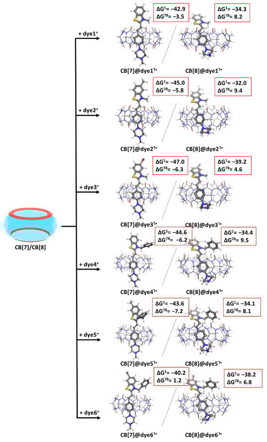 The process of encapsulation of Dyes1-6+ in CB[7/8] is depicted in Figure 3 (first/second column, respectively). The optimized structures of the resulting complexes at the M062X/6-31G(d,p) along with the Gibbs energies (in kcal mol−1) of their formation at the higher M062X/6-31+G(d,p)//M062X/6-31G(d,p) level are given as well.