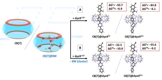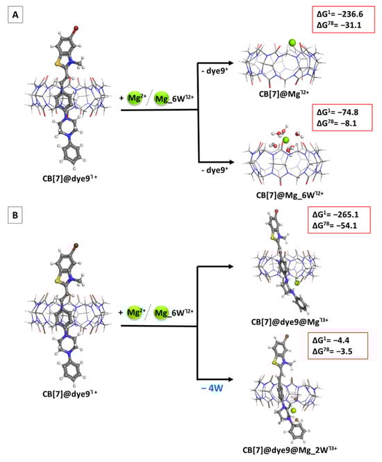 Optimized structures in the gas phase at the M062X/6-31G(d,p) level of theory of the CB[7]@Mg/Mg_6WႨ2+ structures in accordance with Reaction 3 (competitive substitution) (A) and the ternary CB[7]@dye9@Mg/Mg_2WႨ3+ complexes in accordance with Reaction 4 (cooperative addition) (B), along with the corresponding ∆Gε values in kcal mol−1 for their formation. The upper index indicates a reaction in the gas phase (ε = 1), and in a water environment (ε = 78) obtained at the M062X/6-31+G(d,p)//M062X/6-31G(d,p) level.