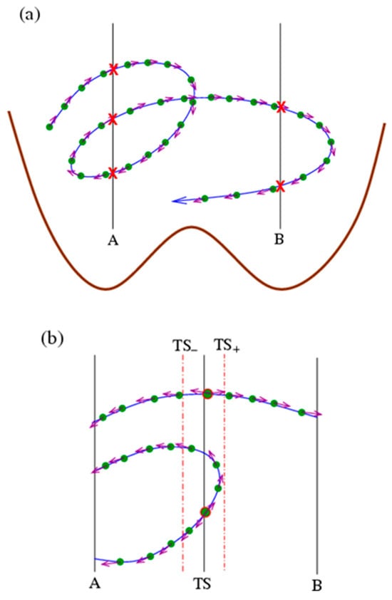 In actual simulations, the initial conformations are randomly chosen from an equilibrium distribution within a TS region , which are determined via umbrella sampling in the examples below, and forward and backward shooting simulations with opposite initial velocities are conducted until they reach basin minima A or B. Then, the backward half path is reversed and assembled with the forward one to give a path passing the TS range, which may be A–A (i.e., A–TS–A), A–B, B–A, and B–B (i.e., B–TS–B) types. It is noted that such a path may contain more than one conformation in the TS region (the number of which is denoted as ), which have the same probability to be chosen as the initial state to generate the path. To avoid any double counting of the same path, the sampled paths using shooting simulations should be corrected by a weight of to be consistent with those in Equation (6). In addition, it is noted that the denominator of Equations (5) and (6) is actually the equilibrium conformation number in basin A. Taking all these together, it yields