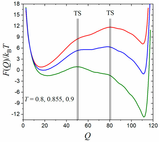 The obtained equilibrium free-energy profiles of CI2 using the umbrella sampling technique are plotted in Figure 2 as a function of the number of native contacts (). The free-energy profiles exhibit a typical double-well form and are quite smooth, with one basin minimum at for unfolded states and another at for folded states. The folded states become more stable with decreasing the temperature. The midpoint temperature at which folded and unfolded states exhibit equal stability was determined to be , where the free-energy barrier is about . We chose two schemes of TS regions in separating folded/unfolded basins, i.e., and (thin black lines in Figure 2), to calculate the equilibrium population ratio of (here can represent unfolded or folded states) as well as preparing initial conformations within the TS region for shooting simulations as required by tRPS in Equation (7).