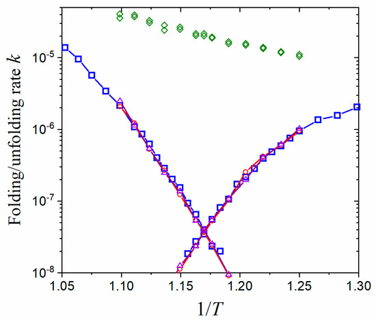 Accelerating folding/unfolding kinetics of CI2 with the tRPS method. Folding (right branches) and unfolding (left branches) rates were measured in a unit of , where is the MD time step. The temperature was measured in a unit of . The folding/unfolding rates of direct simulations were plotted in blue squares, while those obtained using tRPS (Equation (7)) were shown in red circles (with ) and violet triangles (with ). The sampling rates of transition paths were plotted in scattered green diamonds to demonstrate the acceleration effect. Each datapoint of direct simulations was averaged from about 400 folding/unfolding runs, while those of tRPS were each averaged from about 4000 paths.