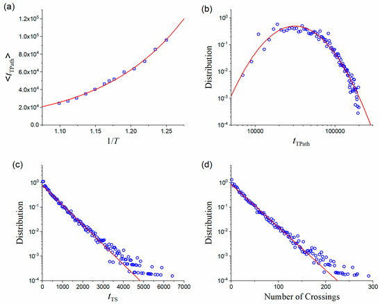 With tRPS, transition paths can readily be obtained for analyses (Figure 4). The average duration of transition paths is in an order of magnitude of steps and increases exponentially with decreasing temperature (Figure 4a), much larger than that for A–A and B–B oscillation paths (in the order of magnitude of steps, see Figure S2). The logarithmic roughly obeys a Gaussian distribution (Figure 4b), similar to previous studies [22,33]. Remarkably, a transition path usually has multiple opportunities to cross the TS region, the number of which well obeys an exponential distribution, i.e., a memoryless distribution (Figure 4d). Consequently, the duration of a path spent within the TS region, , also obeys the exponential distribution (Figure 4c). At the midpoint temperature , the average number of crossing times is about 25, and there is an average of about 540 steps. The large number of crossing times indicates that the conventional transition-state theory would inevitably overestimate the transition rates since it assumes that a transition path crosses the TS region only once. Another discrepancy with the transition-state theory is that the activation enthalpy of folding/unfolding (the minus slope of the unfolding curve in Figure 3 is about 62 at midpoint temperature) is not equal to the enthalpy difference between the TS region and the unfolded/folded state (contributed by the term in Equation (7), which is about 72 for unfolding) due to the contribution of the last term in Equation (7).