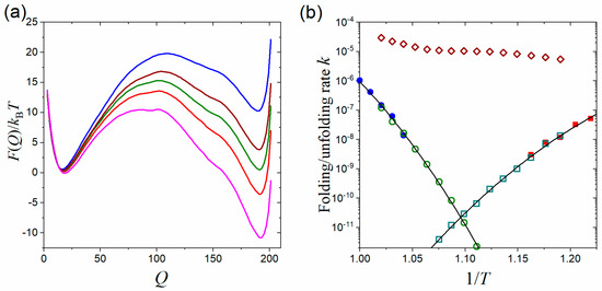 Transition rates decay exponentially with the barrier height, but the duration of transition paths usually depends on the barrier in a much weaker logarithmic law [22,48]. This makes tRPS even more powerful when the barrier is high. As proof, we apply tRPS on another protein, acylphosphatase (PDB ID: 1APS) with 98 residues, which was listed as a slow-folding protein in a previous study [49]. The obtained free-energy profile is smooth, possessing a high barrier of about at a midpoint temperature of (Figure 6a). The folding/unfolding is slow and extremely difficult to determine with direct simulations. Therefore, we conducted direct simulations only in some feasible temperature ranges (filled circles/squares in Figure 6b) and applied tRPS to complete the gaps (open circles/squares). The results of direct simulation and tRPS in the overlapping area are well consistent with each other. The data combine to give a nice chevron plot. As a main expense of tRPS, the average duration (open diamonds in Figure 6b) of transition paths for acylphosphatase is similar in order of magnitude to that for CI2. The increase in the efficiency of kinetic calculation using tRPS is up to five orders of magnitude around the midpoint temperature if not taking into account the expense of equilibrium calculations (for in Equation (7)).