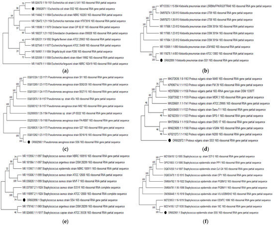 Maximum-likelihood tree of (a) E. coli OR602871, (b) K. pneumoniae OR602899, (c) P. aeruginosa OR602900, (d) P. vulgaris OR602872, (e) S. aureus OR602898, and (f) S. epidermidis OR602901 using neighbor-joining method. Bootstrap values are expressed as a frequency of 1000 replicates, and values less than 50% are not shown. Black dots are showing the bacterial strains isolated, characterized and studied in the current study.