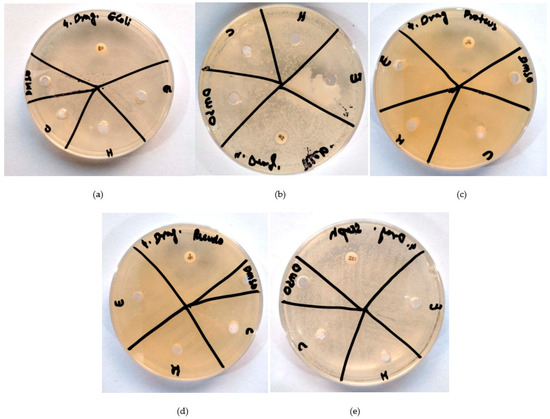 In contrast, the ethanolic extract of O. europaea exhibited sensitivity to bacteria, while the chloroform and hexane extracts showed resistance. Specifically, we observed 15 mm sensitivity of O. europaea against E. coli, 16 mm sensitivity against K. pneumoniae, 8 mm sensitivity against P. vulgaris, and 15 mm sensitivity against P. aeruginosa. O. europaea demonstrated resistance against S. aureus. All bacteria resisted the hexane and chloroform extracts of O. europaea (Figure 4a–e). O. europaea demonstrated resistance against Staphylococcus, contrary to the study by Ben-Amor et al. [26], which showed anti-staphylococcal activity of O. europaea leaf extract. Our results were similar to the study by Sahraoui et al. [27].