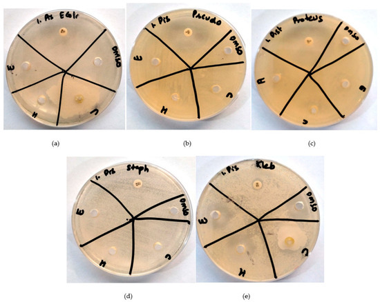 Similarly, the ethanolic extract of P. vera displayed sensitivity to bacteria, while the chloroform and hexane extracts showed resistance. Notably, we observed 28 mm sensitivity of P. vera against E. coli, 25 mm sensitivity against K. pneumoniae, 22 mm sensitivity against P. vulgaris, 25 mm sensitivity against P. aeruginosa, and 22 mm sensitivity against S. aureus. All bacteria resisted the hexane and chloroform extracts of P. vera (Figure 3a–e). A study by Shirzadi-Ahodashti et al. [25] demonstrated the sensitivity of Gram-negative bacteria against P. vera hull, which is as per our study. All bacteria exhibited resistance to the hexane and chloroform extracts of P. vera.