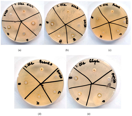 Antibiogram of O. europaea (E = extract in ethanol, H = extract in hexane, C = extract in chloroform, DMSO = negative control. (a): Against E. coli; imipenem as positive control. (b): Against K. pneumoniae; vancomycin as positive control. (c): Against P. vulgaris; ciprofloxacin as positive control. (d): Against P. aeruginosa; levofloxacin as positive control. (e): Against S. aureus; amikacin as positive control).