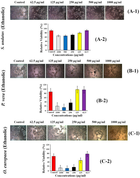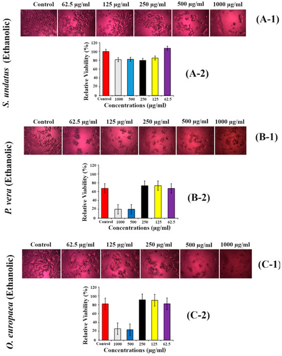 Cytotoxicity assays of S. undatus (A-1,A-2), P. vera (B-1,B-2) and O. europaea (C-1,C-2) extracts on MCF-7 cell line using MTT assay treated with various concentrations (62.5 µg/mL, 125 µg/mL, 250 µg/mL, 500 µg/mL, and 1000 µg/mL).