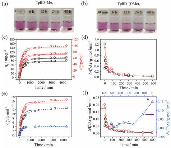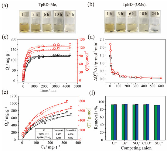 The measured adsorption kinetics data of TpBD-Me2 and TpBD-(OMe)2 were fitted using pseudo-first-order and pseudo-second-order models, as shown in Equations (4) and (5), respectively.