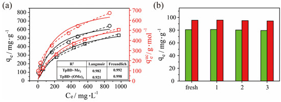 (a) Adsorption isotherms of TpBD-Me2 (square) and TpBD-(OMe)2 (circle) towards I2 in cyclohexane obtained by the values of (black) and (red) at different equilibrium I2 concentration (), which were fitted by Langmuir (solid curves) and Freundlich models (dashed curves). Inset: correlation coefficient of adsorption isotherms fitted by Langmuir and Freundlich models for TpBD-Me2 and TpBD-(OMe)2. (b) Recyclability of TpBD-Me2 (green) and TpBD-(OMe)2 (red) for I2 adsorption in the cyclohexane solution at the initial concentration of 100 mg·L−1.