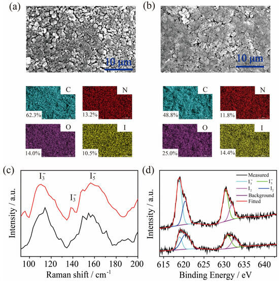 (a,b) SEM images and corresponding elemental mapping images of TpBD-Me2@I2 (a) and TpBD-(OMe)2@I2 (b) and atomic concentrations of different elements were marked on the photos. (c) Raman spectra of TpBD-Me2@I2 (black) and TpBD-(OMe)2@I2 (red) after adsorption equilibrium. (d) High-resolution XPS I3d spectrum of TpBD-Me2@I2 (bottom) andTpBD-(OMe)2@I2 (top). In (a–d), the I2 adsorption was carried out at the initial concentration of 500 mg·L−1 in cyclohexane solution.