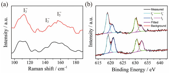 (a) Raman spectra of TpBD-Me2@I3− (black) and TpBD-(OMe)2@I3− (red) after adsorption equilibrium. (b) The high-resolution XPS spectrum of I 3d for TpBD-Me2@I3− (bottom) and TpBD-(OMe)2@I3− (top).