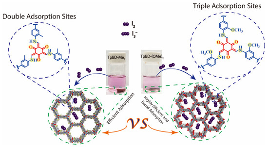 Two kinds of ketoenamine-based covalent organic frameworks (COFs) with electron-rich sites, namely TpBD-Me2 (double adsorption sites) and TpBD-(OMe)2 (triple adsorption sites) for iodine adsorption in solution.