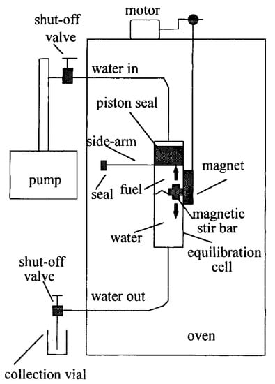 A simple and reliable system for the determination of solubility and partitioning behavior of fuel components in subcritical water up to 523 K was developed by Yang et al. [9] and shown in Figure 2. In this study, the solubility of toluene increased ~23 times by increasing the temperature from ambient temperature to 473 °C, but the pressure change (from 1 to 50 bar) did not affect the solubility values in the solubility studies performed at ambient temperature. The increases in the separation of benzene, toluene, ethylbenzene, xylenes, and naphthalene from gasoline to liquid water when the temperature is increased from ambient temperature to 473 °C range from 10 times for benzene to 60 times for naphthalene. Similarly, increases in the partitioning of polycyclic aromatic hydrocarbons from diesel fuel to liquid water when the temperature was increased from ambient temperature to 523 °C ranged from 130-fold for naphthalene to 470-fold for methylnaphthalene.