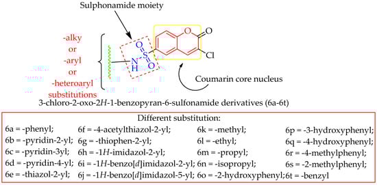 In a previously published paper, the step-by-step procedure for the synthesis of compounds 2, 3, 4, and 5 has already been explained [67]. The following section includes an explanation for the synthesis of 6a, 6b, 6c, 6d, 6i, 6j, 6r, 6s, and 6t: