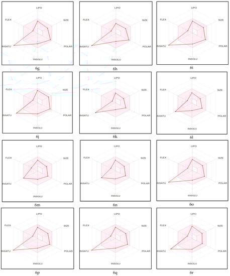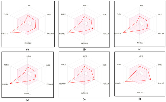 According to the principle put forward by Lipinski and Veber (Table S1 in the Supplementary Information), none of the molecules violated the Lipinski rule of five, but only one molecule violated Veber’s rule. The log p values of all of the compounds discovered ranged from 1.64 to 3.29, which indicates that they have excellent lipophilicity. Lipophilicity is an important property of the molecule that plays a role in determining how it functions inside the body [51]. It is defined by the log p value of the chemical, which evaluates the permeability of the medicine in the body in order for it to reach the target tissue [52,53]. All of the compounds had a molecular weight that was less than 500 Da, which suggests that they can move more easily across biological membranes. It was a fortunate coincidence that the Lipinski rule of 5 had not been broken by any of the compounds, including the native ligand [54,55]. It has been shown that the total polar surface area (TPSA), in addition to the number of rotatable bonds, is a stronger indicator of whether a molecule is orally active or not. Molecule 6f was found to be in violation of Veber’s rule, since it had a TPSA that was more than 140 Å2, or 142.96, which indicates that it has a low oral bioavailability.