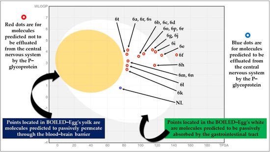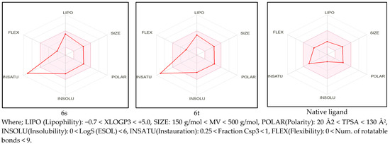 In the physicochemical radar images (Figure 3), all the molecules violated just one criterion, i.e., instauration (0.25 < Fraction Csp3 < 1) except molecules 6m, 6n, and native ligand. The BOILED-EGG model provides a quick, simple, easily repeatable, but statistically unparalleled robust strategy for forecasting the passive gastrointestinal absorption and brain access of tiny compounds relevant for drug discovery and development. The physical and chemical space of molecules with the greatest chance of being absorbed by the digestive system is represented by the white area, and the physical and chemical space of molecules with the greatest chance of penetrating to the brain is represented by the yellow area (the yolk) [57]. None of the designed molecules, including native ligands, displayed permeation through the blood-brain barrier, whereas all were predicted to be passively absorbed by the gastrointestinal tract. All the designed molecules were predicted not to be effluxed from the central nervous system by the P-glycoprotein, whereas, the native ligand predicted to be effluxed from the central nervous system by the P-glycoprotein (Figure 4). Based on the results of this virtual screening, it was determined that 6a–6d, 6g, 6i–6l, and 6r–6t possess drug-like characteristics; as a result, these compounds were investigated further using molecular docking.