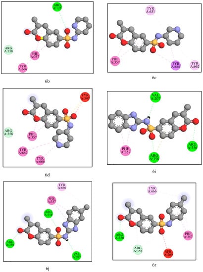6b had a binding affinity of −8.5 Kcal·mol−1 and formed one conventional and one carbon-hydrogen bond with Arg125 and Arg358. It formed hydrophobic π-π stacked interactions with Phe357 and Tyr666. 6c developed only hydrophobic (π-sigma, π-π stacked, and π-alkyl) interactions with Tyr666, Phe357, Tyr631, and Tyr662 with −8.5 Kcal·mol−1 binding free energy. Despite failing to create a hydrogen bond with the enzyme, a stable complex was formed with good binding free energy. 6d had a docking score of −8.3 Kcal·mol−1 and formed one carbon-hydrogen bond with Arg358 and one π-sulfur bond with Tyr547. It has developed some hydrophobic π-π stacked, π-π T-shaped interactions with Phe357, Tyr662, and Tyr666. 6i developed three conventional hydrogen bonds with Val207, Arg356, and Arg358 with a binding affinity of −9.1 Kcal·mol−1. It showed one electrostatic π-cation bond with Arg358 as well as three hydrophobic π-π-stacked π-alkyl bonds with Phe357 and Arg356.