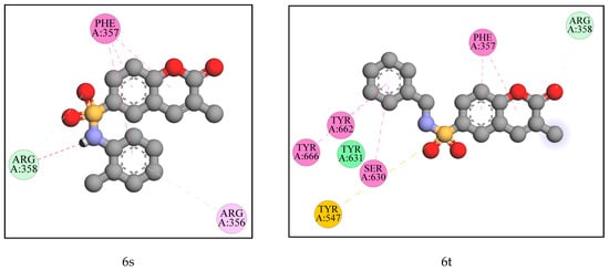 6j had a binding free energy of −9.3 kcal mol1 and displayed the same interactions as 6i. Both of these molecules showed the same binding mode in the active pocket of the target enzyme. With −8.3 Kcal·mol−1 binding free energy, 6r formed one conventional and one carbon-hydrogen bond with Arg356 and Arg358, respectively. Many hydrophobic π-π stacked, π-alkyl bonds have formed with Phe357, Arg356, Arg358, and Tyr666. 6s released −8.1 Kcal·mol−1 of binding free energy and formed one carbon-hydrogen bond with Arg358. It has developed many hydrophobic π-π stacked, π-π T-shaped, and π-alkyl bonds with Phe357 and Arg356. 6t formed one carbon-hydrogen bond with Arg358 and displayed a −8.7 Kcal·mol−1 binding affinity. It has also formed one π-sulfur bond with Tyr547. It has developed many hydrophobic π-π stacked, π-π T-shaped, and amide-π stacked with Phe357, Tyr662, Tyr666, Ser630, and Tyr631. Although the reference inhibitor and the developed compounds revealed slightly different binding behaviors due to the structural variations between them, it was intriguing to note that they both bound in the same binding pocket, as shown in Figure 5. The reference inhibitor and the docked compounds revealed one interaction in common with Arg358, however, the majority of the created molecules had the majority of the same interactions and shared the same amino acids. Each and every one of them developed stacking π-π interactions with Phe357. The findings presented above provide conclusive evidence that all of the ligands exhibited binding in the same cavity. From the above investigation, it was observed that, 6a, 6b, 6c, 6d, 6i, 6j, 6r, 6s, and 6t displayed more binding affinity than the reference inhibitor and were hence selected for wet lab synthesis, and the structures were confirmed by spectral analysis.