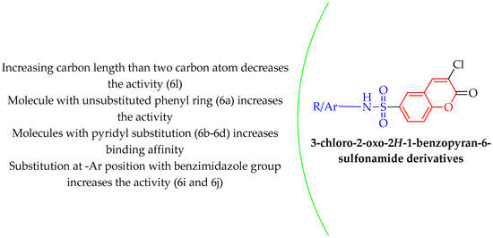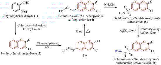 In 20 mL ethanol and 5 mL DMF, a combination of compound 5 (3 mmol), suitable aryl chloride (3 mmol), and K2CO3 (3 mmol) were refluxed. TLC was used to monitor the reaction’s completion. The surplus solvent was dumped onto the ice and the pH was corrected to pH 7.0. (6 to 8). Vacuum filtration was used to collect the produced solid. Column chromatography was used to purify the crude solid, using EtAc/Pet. ether as the eluent (40:60). Physical characterization and recrystallization of the obtained products were carried out [68]. The step-by-step reaction route that followed in order to produce coumarin-based sulphonamide derivatives is shown in Figure 9.