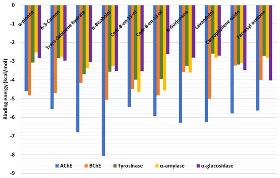 All docked compounds bound to all five enzymes, with a potential preference for AChE and BChE (Figure 4). The detailed protein–ligand interactions provided insights into the binding patterns of some selected compounds. All the study compounds were quite small molecules, hence freely bound to the active sites of the target proteins. α-Bisabolol was accommodated in the catalytic channel of AChE via an H-bond with Phe295 and multiple hydrophobic interactions, while van der Waals interactions reinforced the binding (Figure 5A). Similarly, cedr-8-en-13-ol occupied the catalytic pocket of BChE, mainly via an H-bond with His438, and multiple hydrophobic interactions, with a couple of van der Waals interactions contributing to the overall binding affinity (Figure 5B). Interestingly, trans-sabinene hydrate fit in the relatively narrow catalytic channel of tyrosinase, forming an H-bond via a hydroxyl group with Ser375, a hydrophobic interaction, and a couple of van der Waals interactions; however, the active-site copper metal ions were not engaged in any interactions (Figure 6A). In the case of α-amylase, cedr-8-en-15-ol formed two H-bonds with Trp59 and Gln63 via a hydroxyl group, a couple of hydrophobic interactions, and van der Waals interactions with the active site residues (Figure 6B). Additionally, caryophyllene oxide is completely buried in the catalytic cavity of α-glucosidase, forming an H-bond with Arg267, multiple hydrophobic and van der Waals interactions all over the channel (Figure 6C). Taken together, H-bonds and hydrophobic contacts are the key interactions with which the selected phytochemicals from C. obtusa, C. nigritanus, and L. coronopifolia extracts bind to, and potentially inhibit these enzymes.