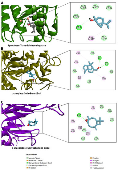 Protein–ligand interaction: (A) tyrosinase and trans-sabinene hydrate, (B) α-amylase and cedr-8-en-15-ol, and (C) α-glucosidase and caryophyllene oxide. These phytochemical compounds were extracted from C. obtusa, C. nigritanus and L. coronopifolia.
