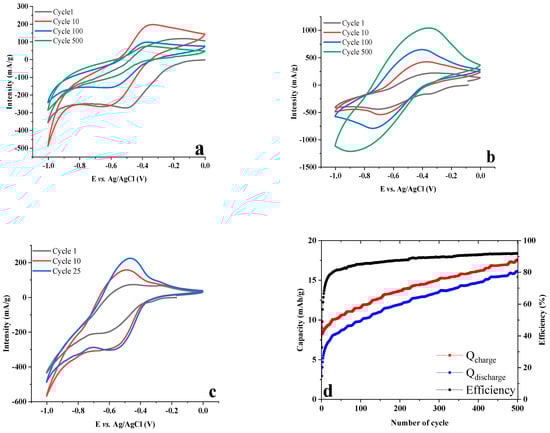 By decreasing the scan rate down to 1 mV/s, such potential separation decreases significantly underlining that the redox reaction is kinetically limited. The redox reduction wave is still centered at −0.5 V vs. Ag/AgCl after 25 cycles (Figure 3c). The associated capacity value obtained in the first cycle is of 30.4 mAh/g (42.5 % theoretical capacity) and 72.8 mAh/g (101% theoretical capacity) after the 500th cycle (Table S1). This last value, close to the theoretical capacity, is a direct consequence of water electrolyte reactions which occur below −0.9 V vs. Ag/AgCl. By combining these results to plot the capacity evolution as a function of v −0.5 (where v is the scan rate in mV.s−1, Figure S5), it is possible to characterize the electrochemical process knowing that the maximum surface capacitive response is extrapolated when the scan rate tends to infinite, i.e., v −0.5 → 0. This surface capacitive response is zero here, underlining that the electrochemical process is not capacitive at all (Qsurface = 0) but is faradic in nature, as expected by its strong dependence with respect to the scan rate.