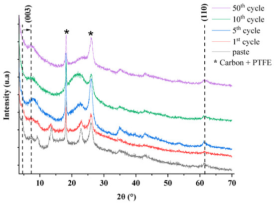 XRD of LDH−FCm electrode after 1st, 5th, 10th and 50th cycles in sodium acetate at 10 mV/s.