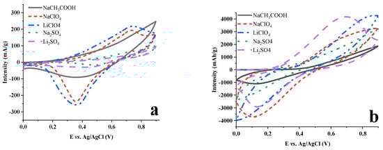 For electrochemical experiments sodium acetate (CH3COONa, ≥99%, Merck, Saint-Quentin-Fallavier, France), sodium nitrate (NaNO3, 99%, Merck, Saint-Quentin-Fallavier, France), sodium perchlorate (NaClO4, 99%, Merck), lithium perchlorate (LiClO4, 99%, Merck, Saint-Quentin-Fallavier, France), sodium sulfate (Na2SO4, 98%, Merck, Saint-Quentin-Fallavier, France) and lithium sulfate (Li2SO4, 99%, Merck, Saint-Quentin-Fallavier, France) were used. Deionized water was employed for all experiments.