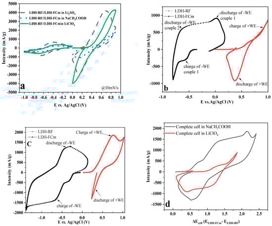 Results of CV experiments of LDH−FCm and LDH−FCd in different electrolytes at 10 mV/s.
