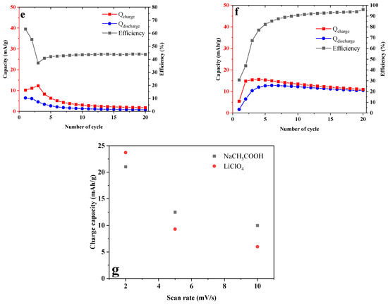 The discharge capacity obtained on the first discharge is around 7 mAh/g in sodium acetate and (Figure 6e) and less than 2 mAh/g in lithium perchlorate (Figure 6f). In addition, different scan rates have been tested for this system. A charge that is close to 20–25 mAh/g (Figure 6g) during charge is obtained and 2 mV/s on the first discharge for the two aqueous electrolytes, but they rapidly fade upon cycling.