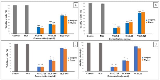 Viability of cells in the presence of encapsulated oregano and thyme EOs: (a) P. vancouverensis; (b) Flavobacterium sp.; (c) P. eryngii; (d) P. lilacinum. Where * is p < 0.05; ** is p < 0.01; *** is p < 0.001.