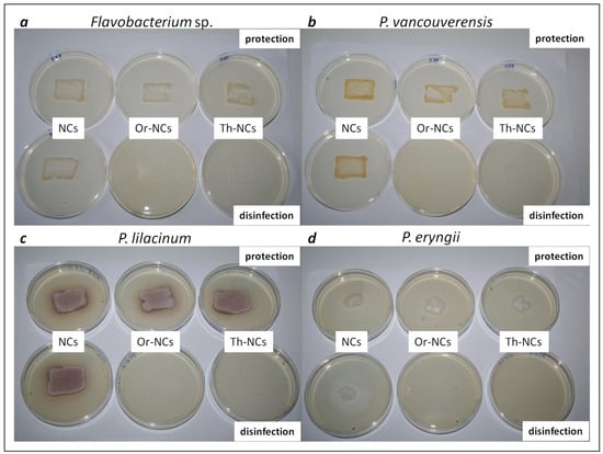 Microbial cultures transferred from the material surfaces treated with empty NCs and EOs-NCs (tested for their protection and disinfection effects) to Petri dishes, using the agar plate printing method. The pictures show bacteria and fungi biofilms, (a) Flavobacterium sp. (sandstone); (b) P. vancouverensis (sandstone); (c) P. lilacinum (sandstone); (d) P. eryngii (whitewood).
