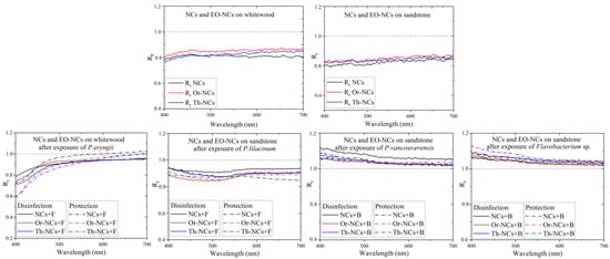 Figure 3 shows the Rr values of the whitewood and sandstone substrates. The Rr changes due to the application of NCs and EO-NCs on wood and sandstone before microbial cells exposure in the visible region were very similar. The general trend for both surfaces with the applied NCs and EOs-NCs was a decreased substrate reflectivity in the visible spectrum due to a substantial absorption cross-section of EOs and NCs in the visible spectral region. The reflectivity changed significantly after exposure to the microbial cultures. A significant shift in Rr close to 1 was detected after adding P. eryngii, while the reflectivity after exposure to P. lilacium was approximately the same as before the exposure. On the other hand, after exposure of the bacterial cells to a substrate, we observed a significant reflectivity increase in the blue-green part of the visible spectrum. These results suggested that the reflectivity measurement is a suitable method for detecting sandstone deterioration by bacterial cells because it allows measuring a significant shift in the Rr values in the visible spectral region.