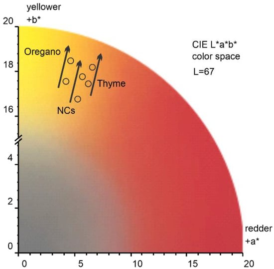To account for a perceived color change after the application of Or-NCs, Th-NCs, and NCs, we evaluated the color changes in CIELAB color space (CIE L*a*b*), which was defined by the International Commission on Illumination (abbreviated CIE) in 1976. A CIE standard illuminant D65 (T = 6500 K) was used to calculate the a* and b* values. As a representative example, Figure 4 shows the color change of sandstone after the application of Or-NCs, Th-NCs, and NCs. The effect of all applied films resulted in a similar overall color change of = 1 ± 0.13, with b* being the major component, underlying a perceived color change toward a yellow hue indicated by a black arrow in Figure 4.