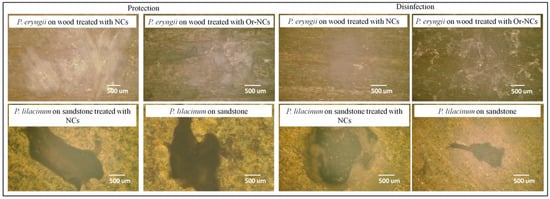 The direct method of detecting microbial cells on a substrate surface, such as digital microscopy, is complex due to the porosity and roughness of the treated material. Bacterial cells on the sandstone surface could not be observed. The ability of fungal cells to form hyphae and spores allows a more straightforward penetration into the structure of materials and growth on the material surface. Figure 5 represents fungal cells of P. eryngii and P. lilacinum on a wood or sandstone surface untreated and treated with NCs and Or-NCs analyzed by digital microscopy. After exposure to P. eryngii, white fungal spores were visible on wood. This observation is consistent with the diffuse reflectivity measurement, where the reflectivity ratio Rr of the individual samples (disinfection and protection effect) was close to 1 after exposure to P. eryngii. It means that the reflectivity after exposure to fungal cells was higher than for samples that were not exposed to the fungal cells. In this case, the reflectivity measurement could be a suitable method for detecting fungal cells on wood surfaces.