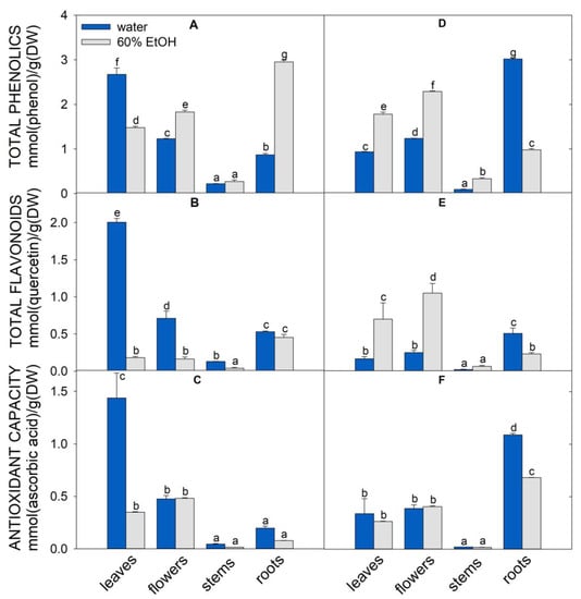 Characterization of A. eupatoria (A–C) and O. vulgare (D–F) extracts prepared in water (blue columns) or 60% ethanol (gray columns). Total phenolics (A,D), total flavonoids (B,E), antioxidant capacity determined by FRAP assay (C,F). The quantity is expressed as mmol per gram of dry plant matter. The values show the mean ± SD. Letters above each bar denote significant differences (p ≤ 0.05) among the groups according to ANOVA (Holm–Sidak method). Abbreviations: DW, dry weight (lyophilizate); FRAP, ferric ion reducing power.