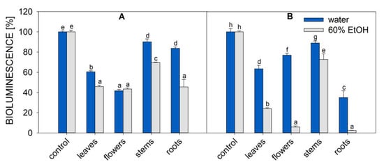 Bioluminescence of PA-Lux (indicating bacteria viability) in the presence of A. eupatoria (A) and O. vulgare (B) extracts prepared in water (blue columns) or 60% ethanol (grey columns). Evaporated extracts dissolved in LB medium were incubated with PA-Lux for 1 h at 37 °C. The plant extract in LB medium (100 μL) was diluted with an equal volume of PA-Lux suspension. Negative control (100%) represents the bioluminescence of PA-Lux with LB medium only. The values show the mean ± SD. Different letters next to each bar denote significant differences (p ≤ 0.05) among the plant groups according to ANOVA (Holm–Sidak method). Abbreviations: LB, Luria broth; PA-Lux, luminescent strain of P. aeruginosa.