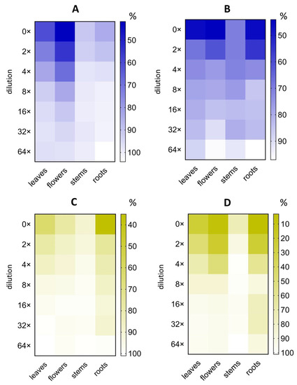 Among all extracts tested in this study, the samples prepared by ethanolic extraction of flowers and roots of Origanum vulgare showed the best overall inhibition of PA-Lux growth (residual luminescence was 6 and 3%, respectively, Figure 2). In A. eupatoria extract, except for stems, all plant parts showed similar PA-Lux growth inhibition rates. After the incubation of various A. eupatoria ethanolic extracts with PA-Lux, the average luminescence decreased to 46–44% of control for root, leaf, and flower extracts, but the lowest growth inhibition was obtained when using stem extracts from both plants, regardless of extraction method. For A. eupatoria, the average luminescence of stems was 90% for aqueous extracts and 70% for ethanolic extracts. For O. vulgare, the average luminescence of stems was 89% for aqueous extracts and 73% for ethanolic extracts. In all cases, except for A. eupatoria flowers, water extracts were less effective in suppressing PA-Lux growth than ethanolic extracts. However, water extracts of O. vulgare roots and leaves and A. eupatoria leaves and flowers also significantly reduced PA-Lux growth (Figure 2).