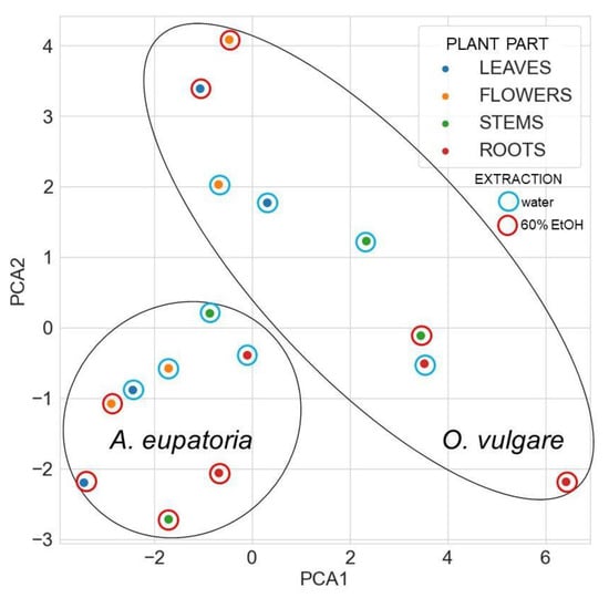 Principal component analysis based on detected secondary metabolites revealed that all A. eupatoria extracts differ from O. vulgare extracts (Figure 4).