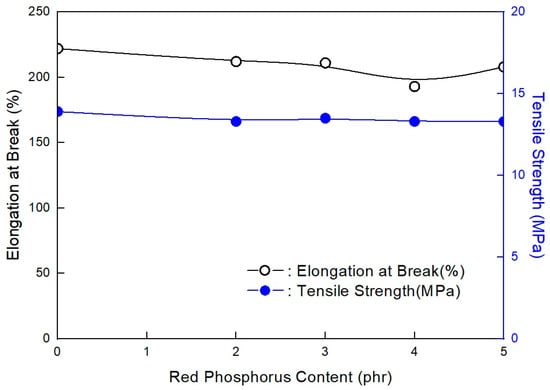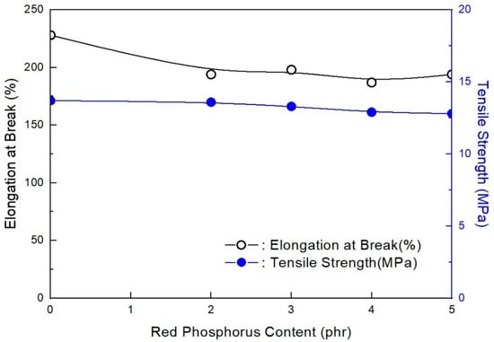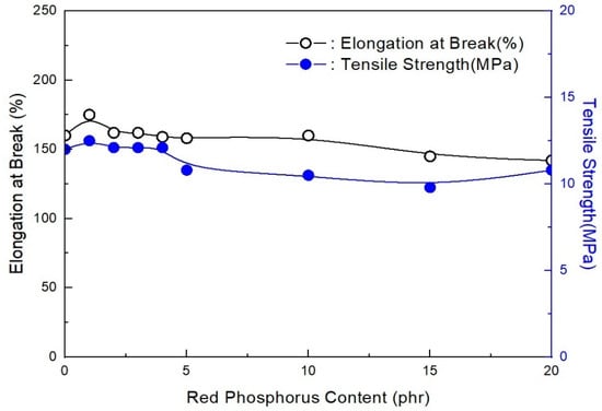 RP has a pure elemental activity that allows matches to ignite, making it the most powerful flame retardant known. To assess the effect of RP without ZB on the mechanical properties of EVA/LLDPE, tensile strength and elongation at break were measured. The effect of RP content on the tensile properties of EVA/LLDPE composites is shown in Figure 1.