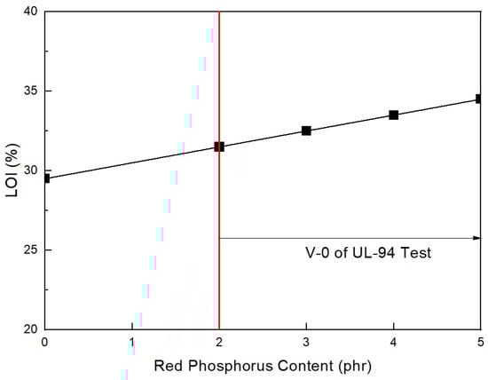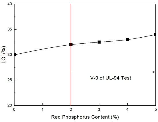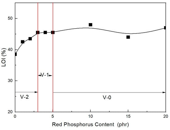 Table 1 lists the UL-94 ratings and LOI test results for the EVA/LLDPE composite samples without the ZB and MH + RP additives. As shown in Figure 2, the LOI greatly increased with an increasing amount of RP content, even though the total content of flame retardants (main + intumescent flame retardant) was the same in all formulations. These findings are similar to the results of Feng et al. [], who found that increasing the flame-retardant content leads to an increase in the LOI. However, only content comprising formulations greater than 5 phr RP pass V-0 of the UL-94 test. Under 5 phr, the RP content formulations cannot pass V-0 of the UL-94 test. This indicates that 5 phr RP is the minimum to pass V-0 of the UL-94 test when only RP is formulated as an intumescent flame retardant. Smaller RP content formulations and a combination of ZB formulations are recommended to avoid a decrease in mechanical properties and to increase flame retardancy. In addition, their synergistic effects lead to better mechanical properties. Thus, mixing magnesium with other additives is highly recommended, as long as it produces synergistic effects. Lee et al. [] established that adding high levels of MH filler affects the mechanical properties of composite materials.