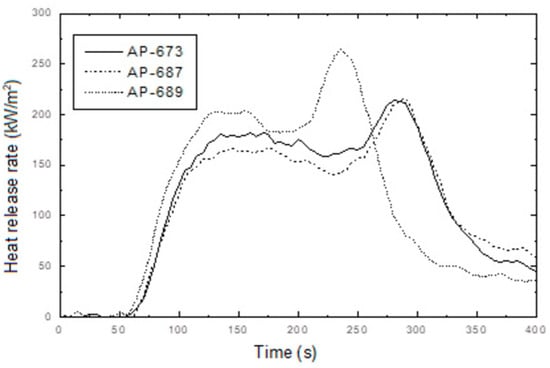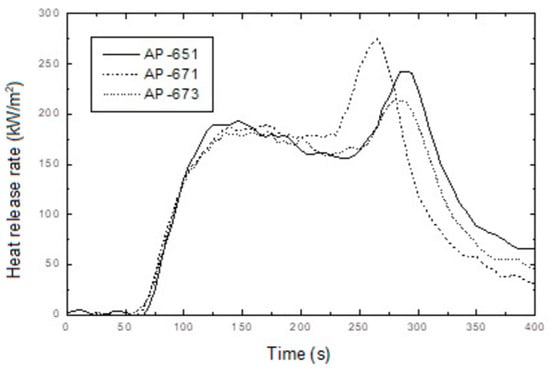 Heat release rate curves of AP-651, AP-671 and AP-673 as a function of burning time.