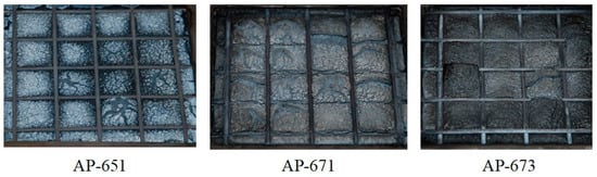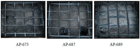 In addition, confusing results were observed from the cone calorimeter test, as shown in Figure 5. The tendency between RP content, PHRR time, and total HRR is not shown. Namely, the non-RP content formulation (AP-651) and 5 phr RP content formulation (AP-673) indicated almost the same PHRR time and total HRR, whereas the 3 phr RP content formulation (AP-671) showed higher and quicker PHRR. These results may come from experimental errors or unknown factors. In general, a higher RP content formulation showed lower PHRR; however, AP-671 (3 phr RP content formulation) showed the highest PHRR, exhibiting the lowest FPI. Such a correlation between FPI and the time to flashover of a substantial fire was observed with a decrease in the FPI, advancing the time to flashover []. In this case, the ability of low RP content was probably because of promoting the formation of a more efficient barrier to volatiles, and heat transfer allowed for further reducing the FPI values. However, definite differences were observed from residuals after the cone calorimeter (see Figure 6). Tar formation was observed in RP content formulations, and tar formation from RP can increase flame retardancy.