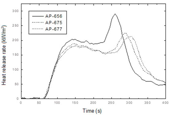 Heat release rate curves of AP-656, AP-675 and AP-677 as a function of burning time.