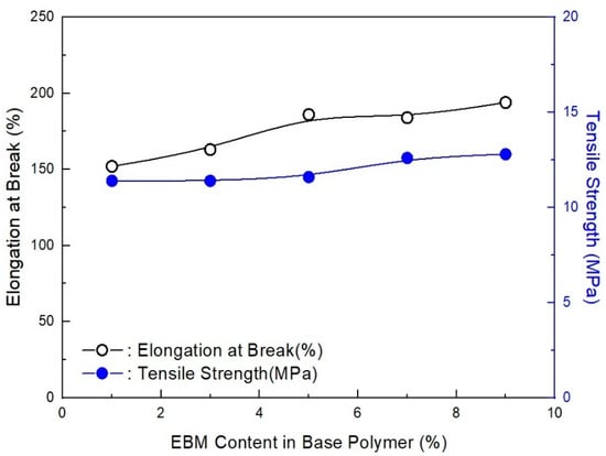 Two mechanical properties—tensile strength and elongation at break—were tested and were found to have an indirect relationship with EBM content. Thus, the content increased elongation at break while tensile strength decreased and vice versa.