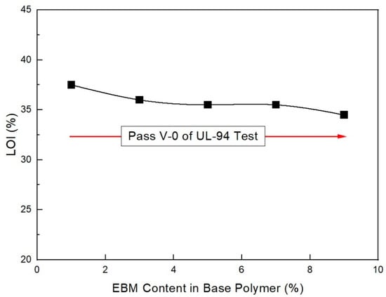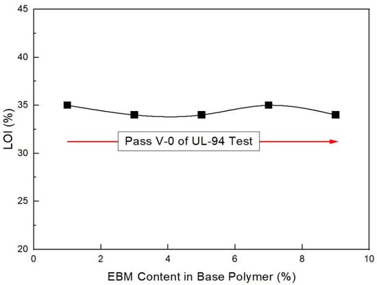 In addition, as shown in Figure 19, flame retardancy increased with decreasing EBM content. All the formulations met V-0 of the UL-94 test. This result coincides with a previous study []. From the mechanical and flame retardancy results, a suitable formulation can be selected for the final purpose because all the formulations met the specifications.