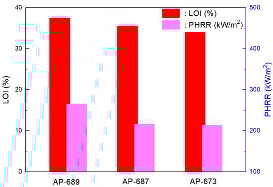Relationships between LOI and PHRR in EBM content formulations. EBM content: AP-689 = 1 phr, AP-687 = 5 phr and AP-689 = 9 phr.
